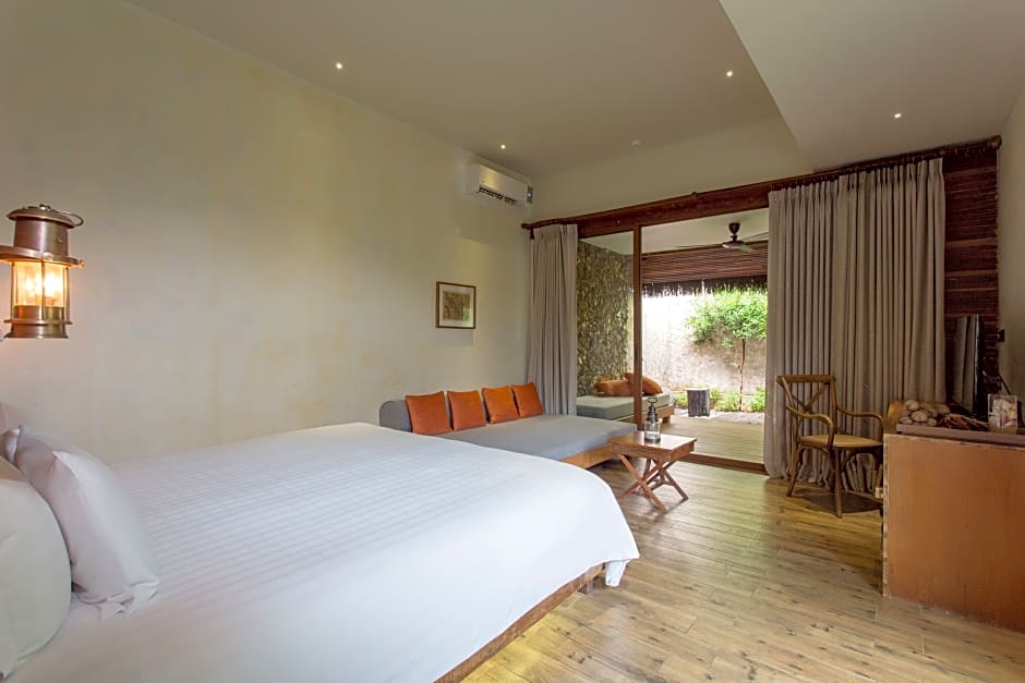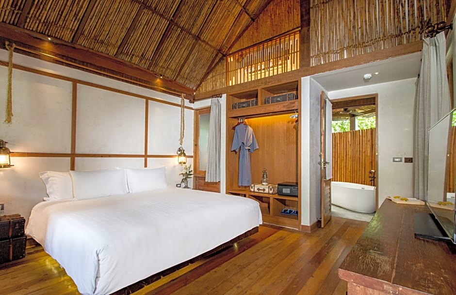 Deluxe Seaview Jacuzzi is 344 square feet and includes a king-size bed 150-183 width plus balcony and extra beds on demand.